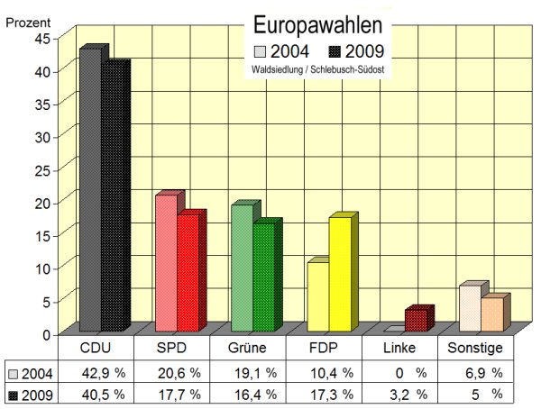 Den größten Zuwachs erreichten die Liberalen mit 6,8 Punkten im Bezirk Waldsiedlung / Schlebusch-Süd, wo die CDU jedoch nur 3,1 Punkte ließ. Dort ging der FDP-Erfolg klar zulasten von SPD und Grünen, die mit Verlusten von 3,6 bzw. 1,3 Prozent dort prozentual die größten Verluste einfuhren. [...]